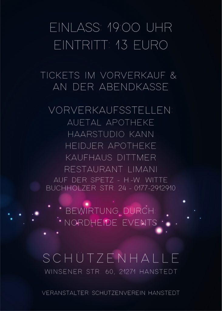 Auch dieses Jahr freut sich der SV Hanstedt in seiner Schützenhalle die Oldie Disco präsentieren zu dürfen. DJ Mako spielt die größten Hits der 70er, 80er und 90er Jahre. Die Bewirtung übernimmt das Team von Nordheide Events.